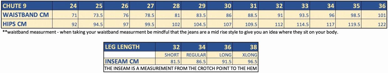 Nothing worse than getting the wrong size, so follow these tips to help get it right. Measure your hips (widest part as seen in the sizing image below) as this is the area the jeans need to get over. The waist measurement is the length of the waistband of the jeans. This means that you shouldn't measure your true waist as the jeans will sit below this. The jeans are a mid rise fit to give you an idea of where they will sit on your body (also see in the sizing image below). Be mindful that there is not much stretch in them, so for a tighter fit we don't recommend dropping a full size (eg. 28 to a 26), however a half size you could get away with (eg. 28 to a 27). This chart is only a guide, the waistband measurement / Hip measurement ratio will not always match up due to our differing body types. If you are in doubt I would measure your widest part of your hips and choose your size off that.